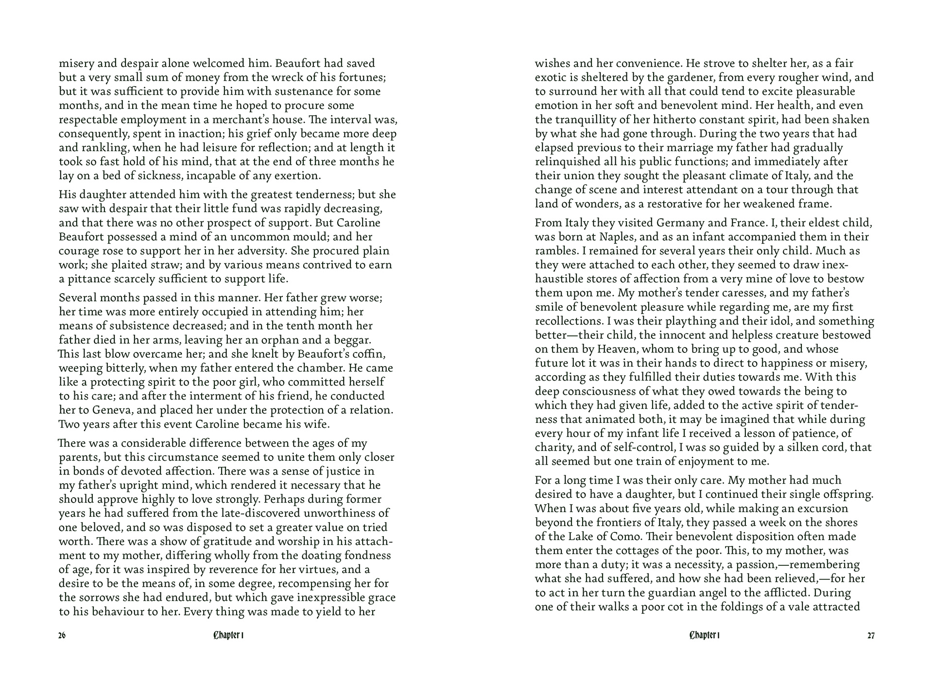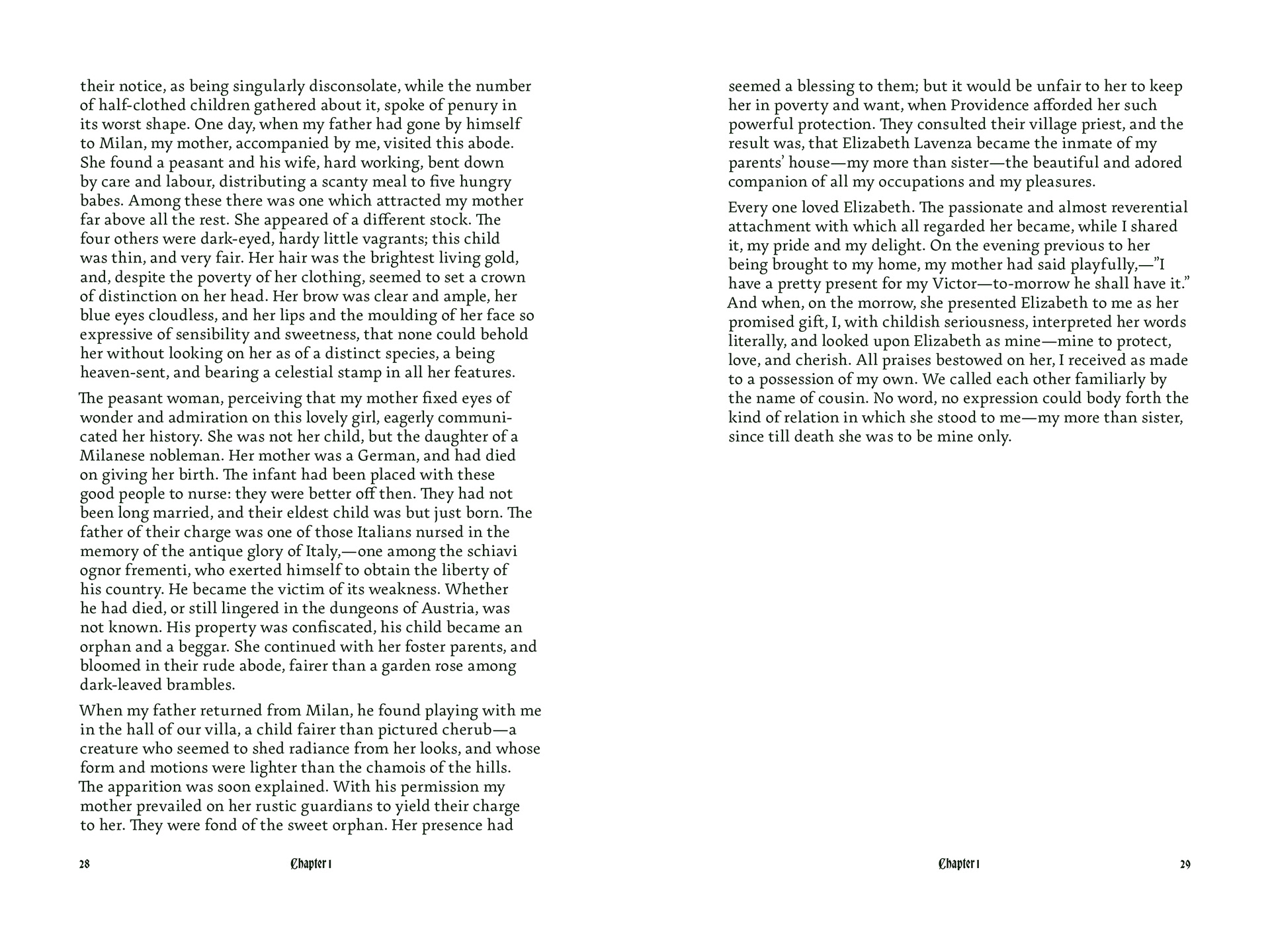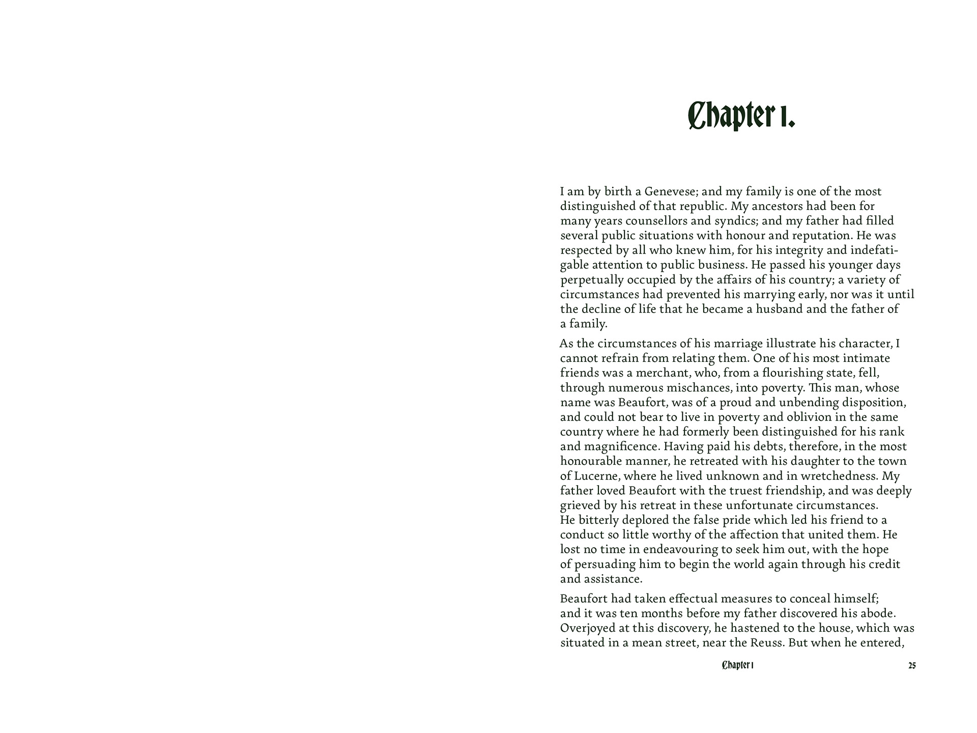 For the interior pages of the book I selected a black letter font to emphasize the older and elegant nature of the gothic horror contents. I paired this with an easy to read serif font for the body text. This font still has a jagged and uneasy nature to it making it a strong thematical and visual pair.