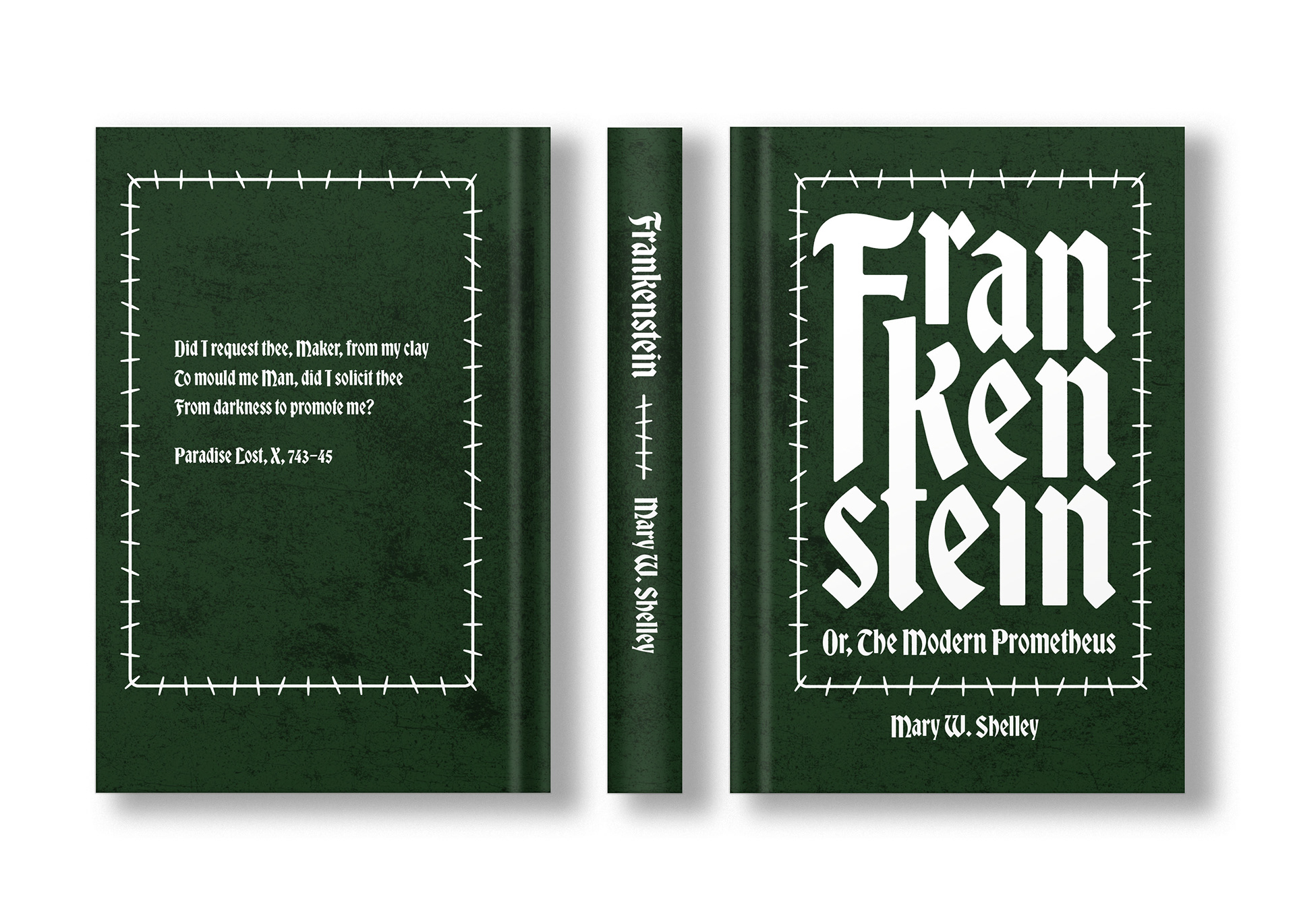 I originally had intended to make an illustration for the cover. As the project progressed I decided to focus on a typographical cover. I decided to piece the letters together in an unnatural way to mimic the monster. I then used a stitch pattern to frame the title.